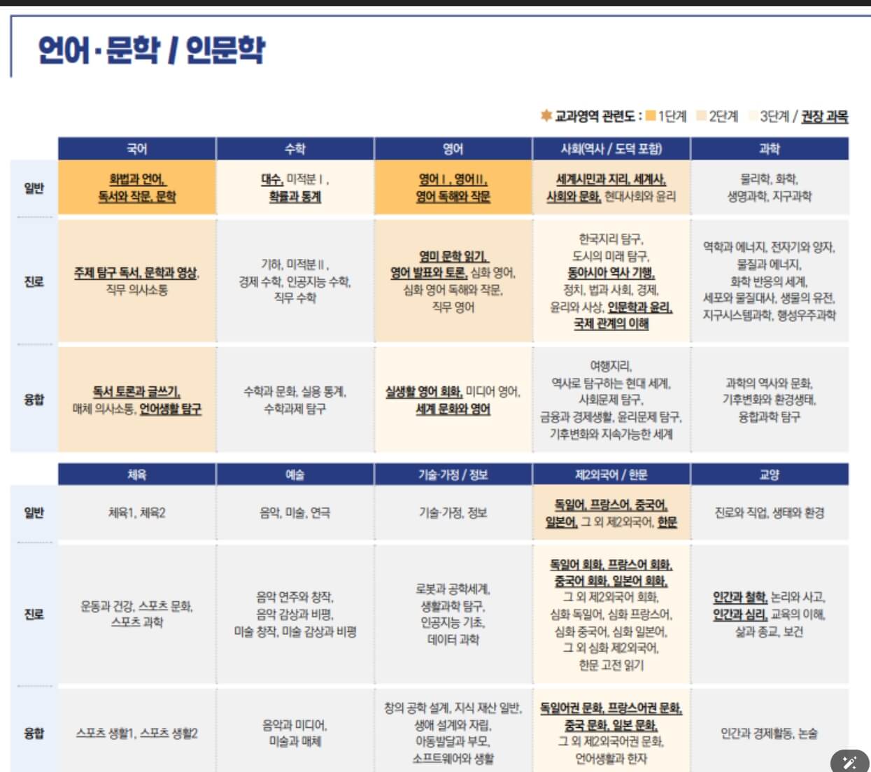 📘 언어·문학·인문학 계열 권장 교과목 완전 정리