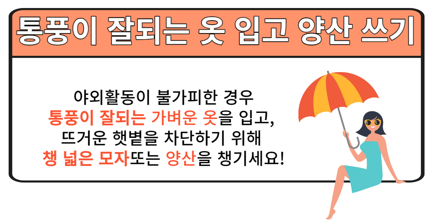7. 적절한 체육활동: 실내에서 가벼운 운동이나 스트레칭을 하는 것은 권장된다. 하지만 실외에서의 과도한 체육활동은 열사병과 탈수를 유발할 수 있으므로 적당한 운동 강도와 시간을 유지해야 한다.