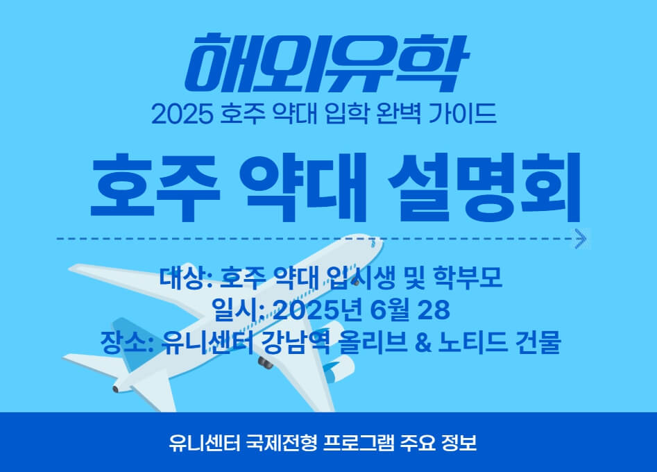 | 국제전형 설명회 | 오후 1시 | 서울 강남 유니센터 | 호주 전지역 대학 편입 시스템, 유니센터 수업 방식 등 안내 |
