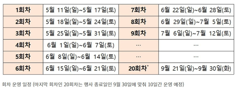 | 운영 방식 | 매주 일~토요일 1회차 기준으로 운영 (총 20회차) |