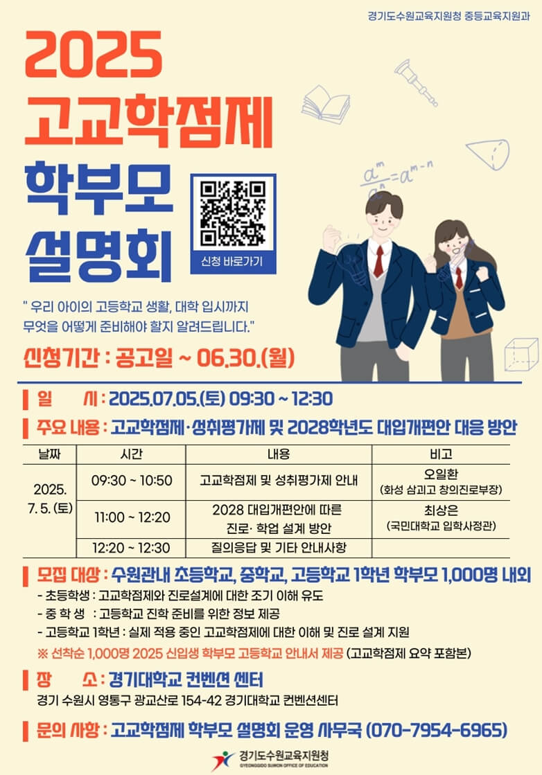 경기도수원교육지원청에서는 학부모님들의 이해를 돕기 위해 **‘2025 고교학점제 학부모 대상 설명회’**를 개최합니다. 본 설명회는 초등학교 고학년부터 고등학교 1학년까지 자녀를 둔 학부모님을 대상으로 하며, 성취평가제, 2028 대입개편안 대응 방안까지 폭넓게 안내될 예정입니다.