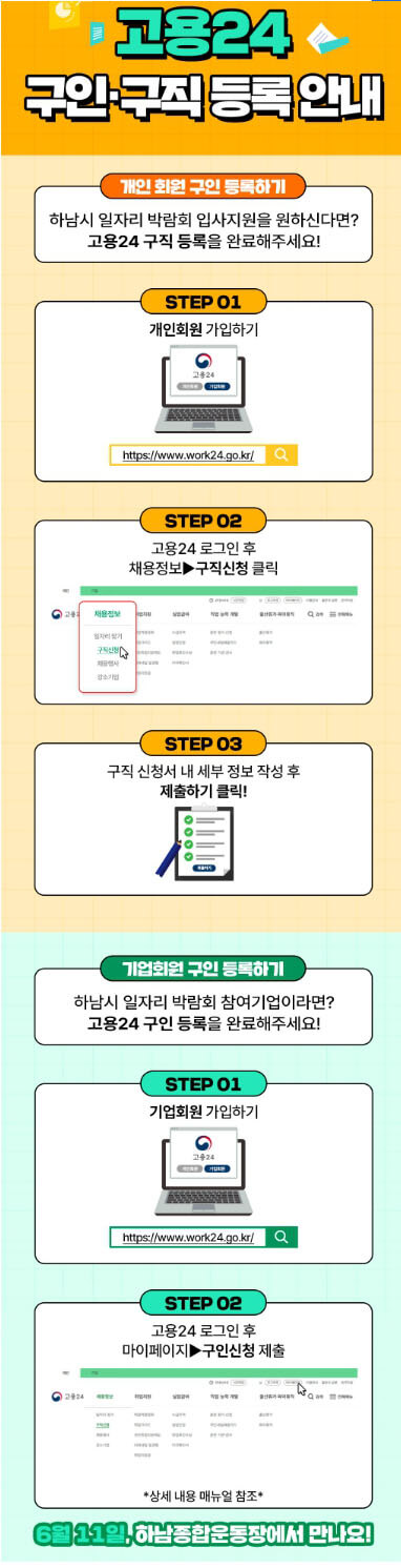 📣 지금 바로 고용24에서 구직 신청하고, 6월 11일 하남종합운동장에서 당신의 미래를 향한 첫걸음을 내딛어보세요!