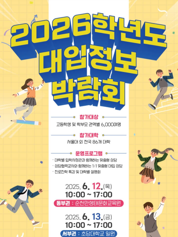 전라남도교육청이 주관하는 **‘2026학년도 대입정보박람회’**가 **2025년 6월 12일(목)**과 6월 13일(금) 양일간 각각 순천만생태문화교육원과 초당대학교에서 개최됩니다.
