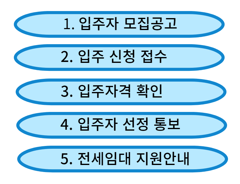 입주신청->입주자선정통보->대상자 선정발표->입주희망주택물색->전세계약가능검토->전세계약체결