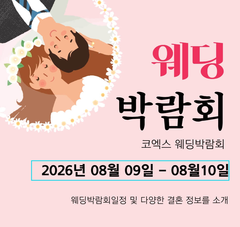 | 서울 강남 | 코엑스 웨딩박람회 | 8월 9일~10일 | 11:00~20:00 | 삼성동 코엑스 | 브랜드 스드메 패키지 |