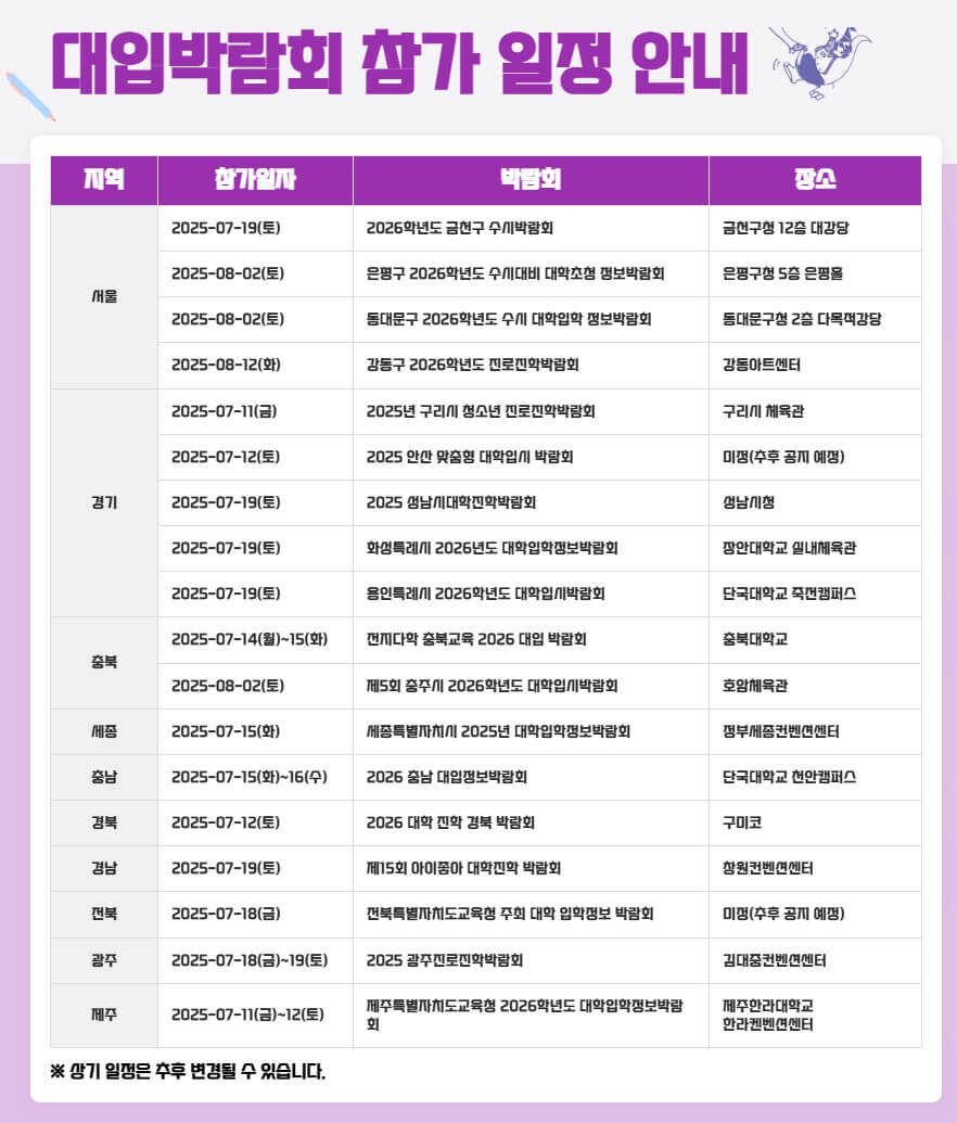 [2025 대학입학설명회 일정 총정리] 전국 지역별 수시·정시 박람회 완벽 가이드 (1) | 2025.07.16 |