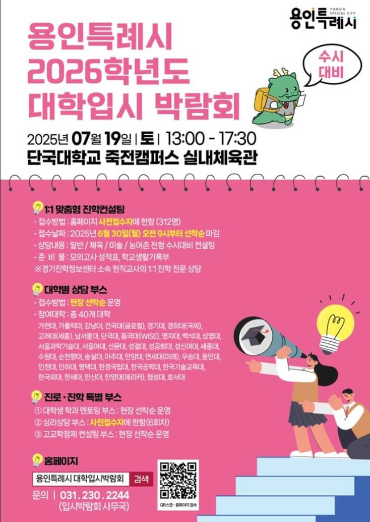 다가오는 2026학년도 수시전형에 대비해, 용인특례시가 주최하는 대학입시 박람회가 2025년 7월 19일(토) 오후 1시~5시 30분, 단국대학교 죽전캠퍼스 실내체육관에서 개최됩니다.
